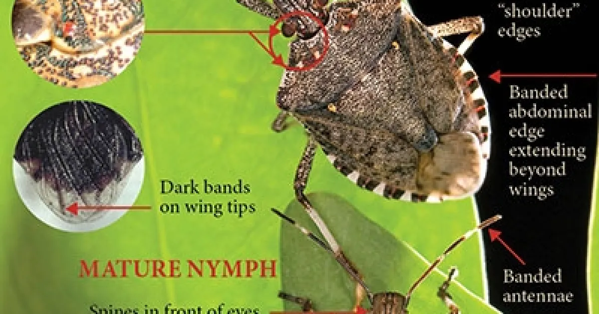 The adult BMSB is a shield-shaped stink bug, about 5/8 inch long, and marbled brown. It can be distinguished from other similar stink bugs by the characteristics shown in Figure 1.