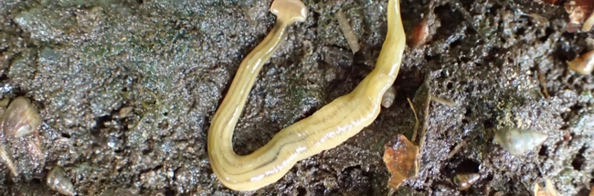 Land planaria are generalist predators of earthworms, slugs, and other mollusks. They capture prey by wrapping their bodies around it and engulfing the prey with mucous. Planaria mouths are not at the end of their body like most animals, but on the underside near the middle of their body. Unlike slugs, land planaria do not have tentacles (such as eyestalks), which is a useful way to distinguish them. Like snails, they are hermaphroditic, meaning each individual has both male and female reproductive organs and can mate readily with any other worm of the same species. Land planaria can also reproduce by binary fission, which is when one individual planarian splits into two. You may remember an experiment from middle or high school science laboratory where a planarian cut in half regrows into two separate planaria.