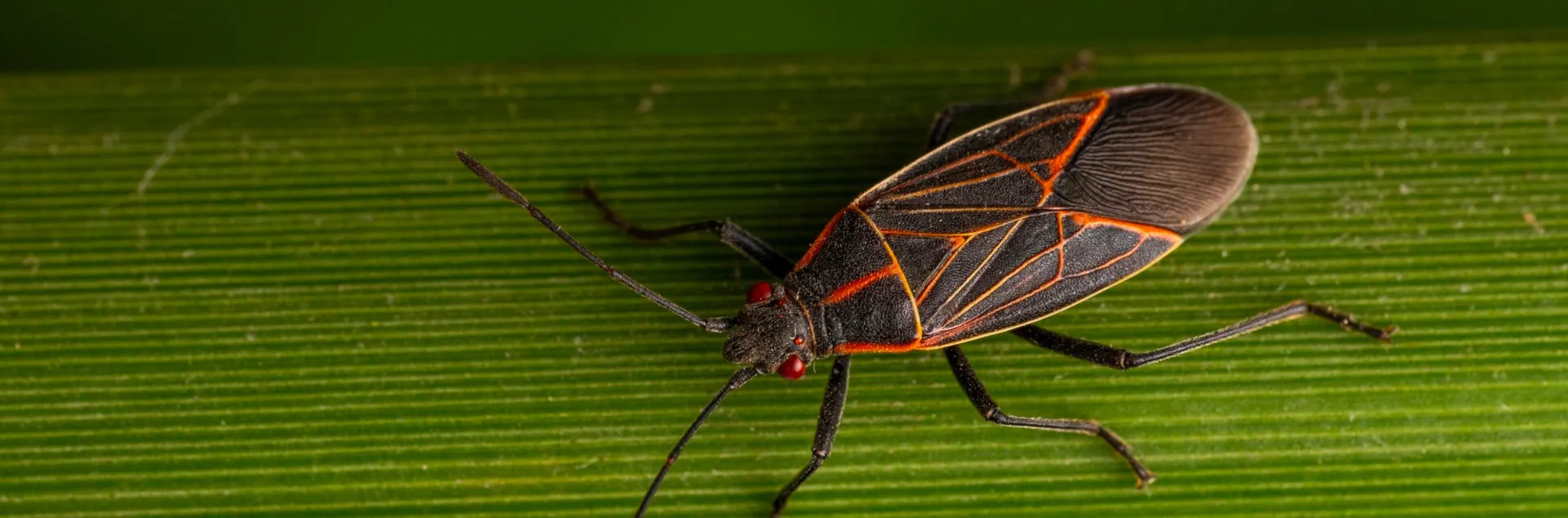 A medium-sized black and red insect with a needlelike mouth attacking a small green insect.