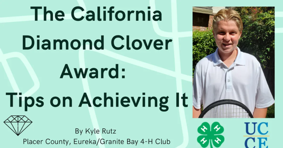 Tip #1 – Read more about the California Diamond Clover Award. The University of California 4-H Youth Development Program website lists the requirements. Knowing what they are will help you plan for achieving them. http://4h.ucanr.edu/Resources/Member_Resources/Scholarships_-_Awards/4-H_Diamond_Clover_Awards/