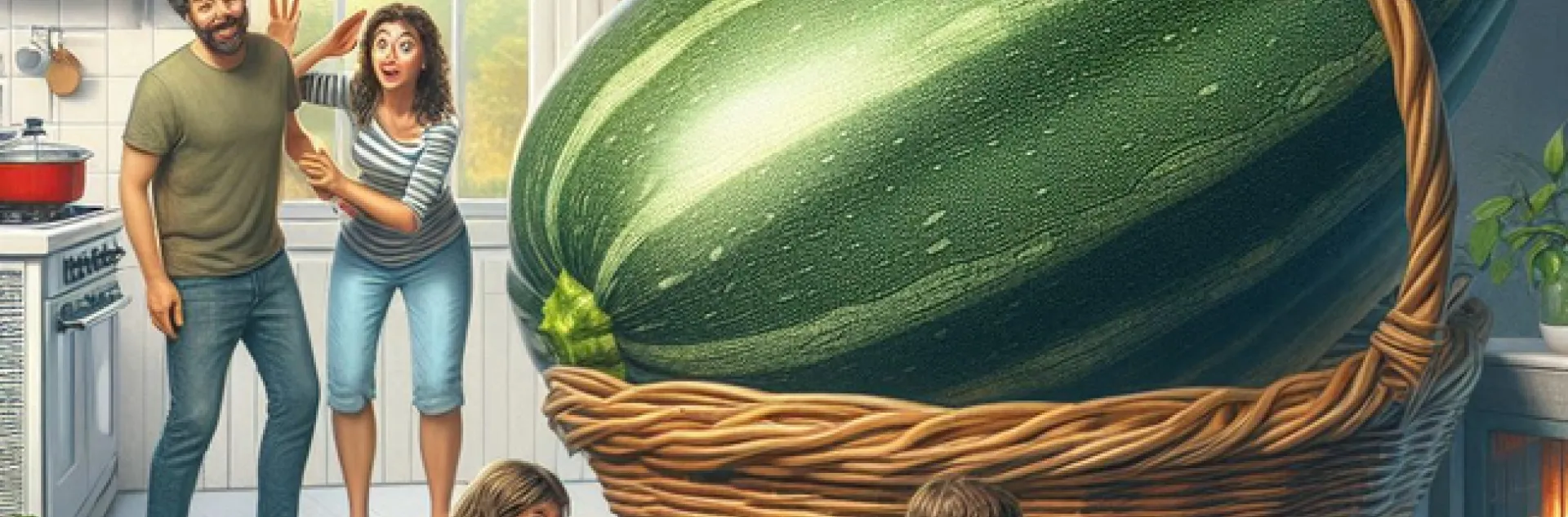 Zucchini cartoon showing a huge zucchini in a basket with little people running away
