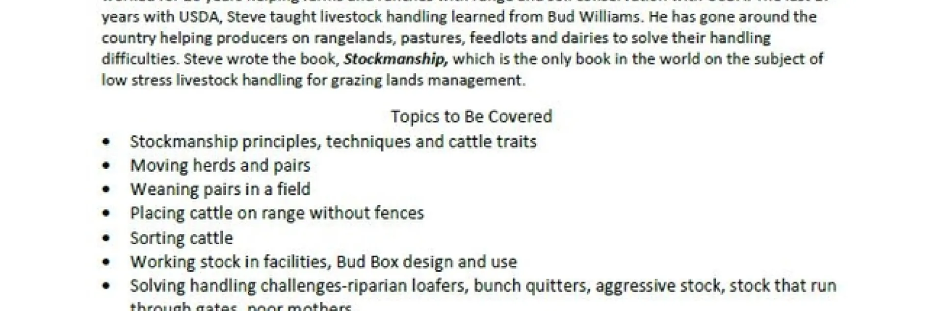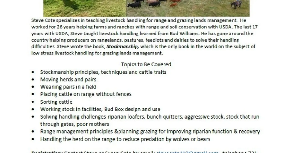 July 16, 2018By Daniel K Macon Print Steve Cote, author of Stockmanship, is offering a four-day, hands-on stockmanship school at Cottonwood Guest Ranch outside of Wells, Nevada. See the flyer below for all the details!