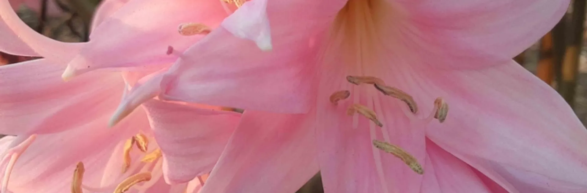 The Amaryllis genus derives from the Greek word for sparkle; in Classical Greece, “Amaryllis” was a typical name for a country girl or shepherdess. And many will already know that the species name belladonna means “beautiful woman” in Italian.  Amaryllis belladonna is an amazing plant that produces clumps of bold, strappy leaves in fall and winter. The foliage dies by early summer and bare stalks emerge in mid-July to August. Each two- to three-foot stalk develops a cluster of up to 12 sweet-smelling, trumpet-shaped four- to six-inch blooms in shades of light rosy pink. Because these bare stalks seem to pop up out of nowhere, the plant is often known as a “naked lady” or “surprise lily.”  It is native to South Africa but has naturalized throughout California.