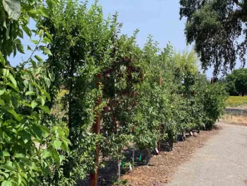 Espalier Garden in July, Laura KlingAlso in keeping with our mission to educate the public was the completion of our beautiful outdoor classroom in May of 2017. We graduated from planks on tree stumps under an enormous oak to a professionally designed and built arbor with furniture that can be easily switched from rows of benches to a combination of tables and benches. The arbor and its placement provide protection from the sun. Our outdoor classroom can seat up to 30 students during our Public Education Workshops (fewer when extra spacing is required for Covid), and is also the setting for smaller MG meetings, including those of our Book Group and the Demonstration Garden Steering Committee. The incredibly generous Support Group of Butte County's University of California Continuing Education (UCCE) occasionally meets there, as do local garden clubs. Again, hard work and generosity conspired to make this project a reality, including substantial donations of time and expertise from the CSU, Chico Construction Management Program's Student Chapter of the Association of General Contractors. Slater and Sons donated engineering expertise, and Greg Melton, of Melton Design Group, donated the design.