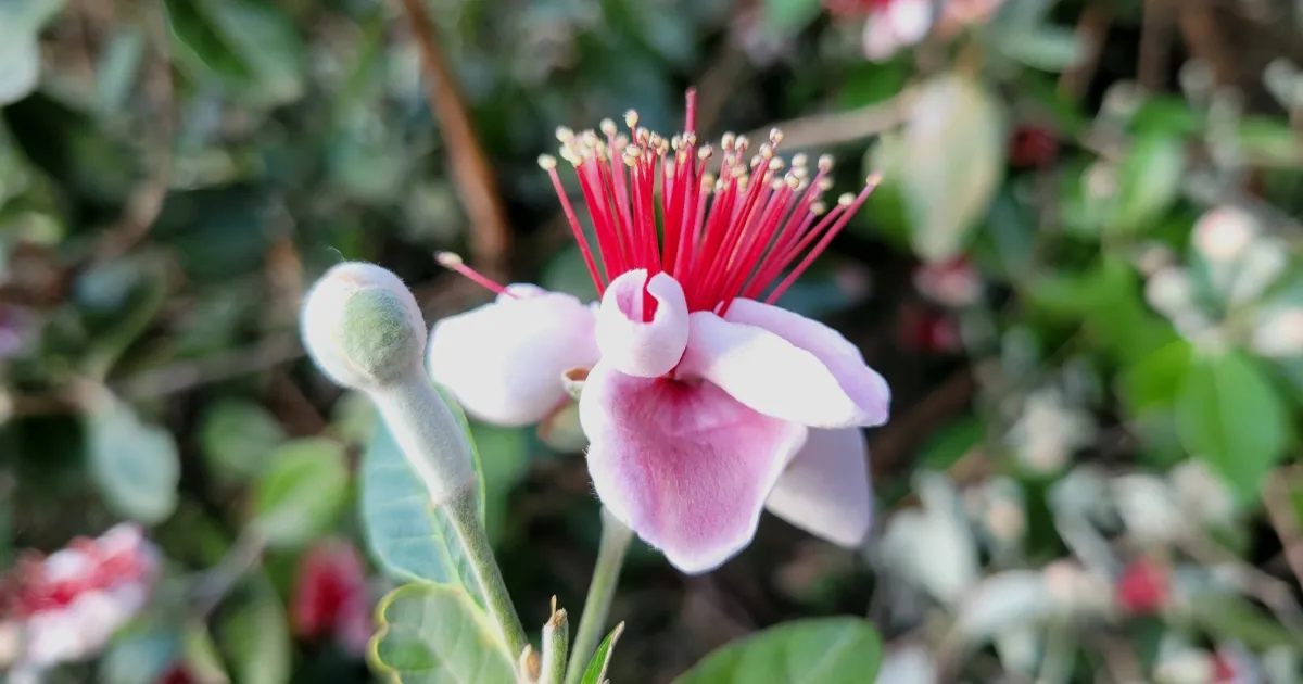 A member of the myrtle family, feijoa leaves are oval, about 3 inches long, glossy-green above, and silvery-white beneath. Blossoms usually appear in late spring (they are in bloom right now locally). The showy blossoms have four fleshy white petals tinged reddish-purple on the inside. A bright tuft of crimson stamens stands upright in the center of the blossom. The fleshy white petals are edible, have a sweet flavor, and can be added for interest to a salad. Feijoa makes an attractive ornamental shrub in home plantings and has few problems in our environment. The fact that its flower petals and any fruits that set are edible is a bonus adding to its value in the landscape.