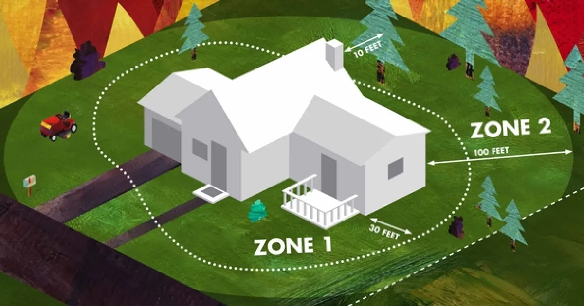 The ground in the inner 30 feet around a home should also be kept free of leaves, pine needles, weeds and other ground fuels. Dead plants and/or tree branches should be immediately removed, as should any tree branches overhanging the roof. Tree branches should also be kept at least 10 feet away from a chimney. Vines growing on trees, shrubs, or fences can act as fire ladders and should be removed. Roofs and gutters should be kept free of leaves, needles and twigs. Gutter covers can reduce, if not eliminate, fuel build-up in this area.