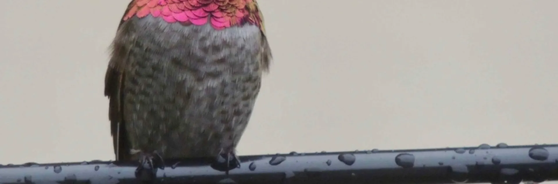 The Anna's hummingbird (Calypte anna), named for 19th century Italian duchess Anna Massena, is one of the larger and more vocal hummingbirds in the United States, and the only one to produce a song. In an elaborate courtship display, the Anna's male flies upward 100 feet or more, then dives at around 50 miles per hour in a U-shaped arc, spreading his tail at the bottom of the dive to create a high-pitched tone and simultaneously flashing his magenta gorget (patch of color at the neck). The Anna's female has a smaller magenta gorget. These birds have adapted to wintering in California when other species migrate, allowing them to take advantage of food sources free from competition.