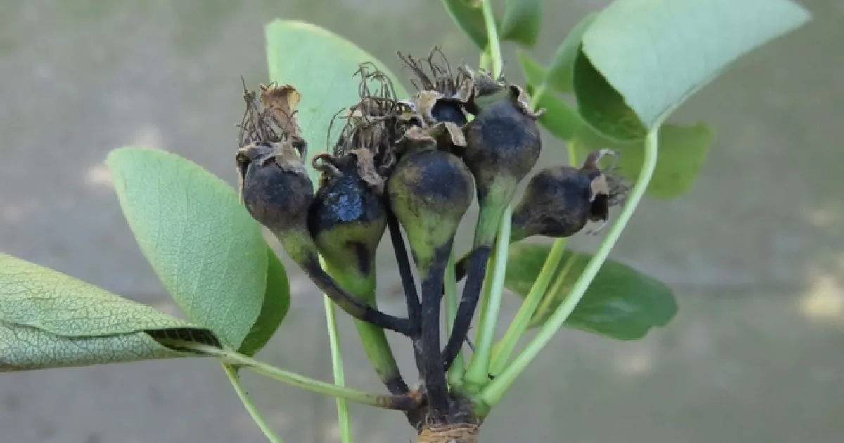 The first sign of fire blight is often the blackening of flowers, shoots or leaves followed by a watery, light tan ooze from affected shoots. Open flowers are the most common infection site and remain susceptible until petal fall.