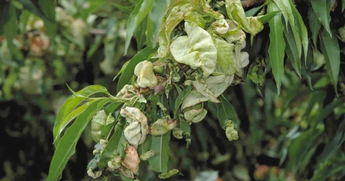 Peach leaves distorted and blistered by peach leaf curl, Jack Kelly Clark, UC IPMNonresistant trees should be treated with a fungicide every year after the leaves have fallen. Generally, a single spraying while the tree is dormant is effective in controlling leaf curl, if applied just prior to bud break. However, during a particularly wet winter, a second spraying just as the flower buds begin to swell (but before the leaves emerge) is advisable.