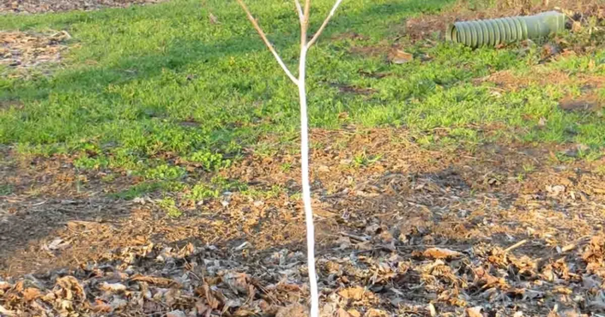 Clear an area about 3 feet wide around the tree, eliminating weeds and grasses to keep them from competing with the tree for water and nutrients. To prevent future weed growth and conserve moisture, a layer of mulch 3 to 6 inches thick can be placed around the tree. However, to avoid crown rot, keep the mulch several inches away from the tree trunk. As a final step, remove the top of the tree by pruning back to a single trunk approximately 24 inches tall and paint the bark of the entire tree trunk with white interior latex paint diluted with water (two parts water to one part paint) as a whitewash to reflect excess heat. This prevents sunburn and the resulting invasion of wood-boring insects that can stunt or kill the new tree.
