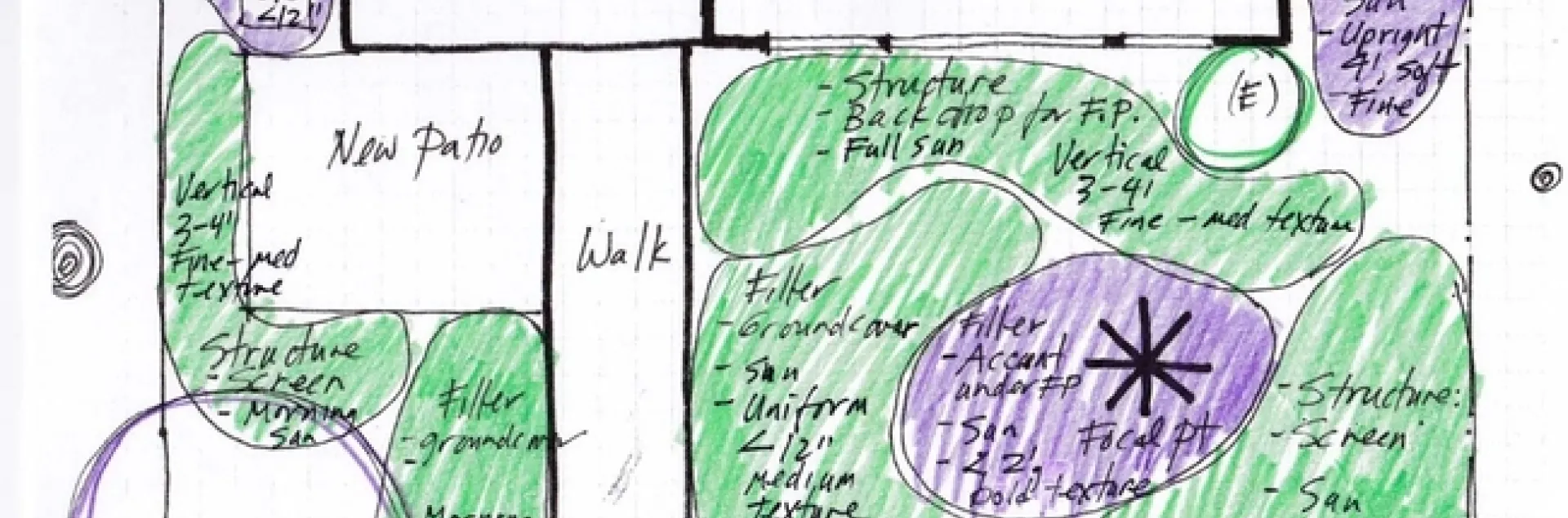 For this phase, think about plant functions rather than individual plants. Start by ‘bubbling in' the location of structural plant masses, and then add filler plant masses. Within each bubble, note the plant function (shade tree, screen plant, accent), the cultural conditions, and whether the plant(s) are to be evergreen or deciduous. Next, think about which plant attributes you want to use to provide contrast and which ones will provide unity. Assign texture and form attributes to each of the bubbles, keeping in mind the 2:1 guideline. Double check to see that you have arranged the plant attributes to provide rhythm, line, and balance in a way that reinforces your garden style.