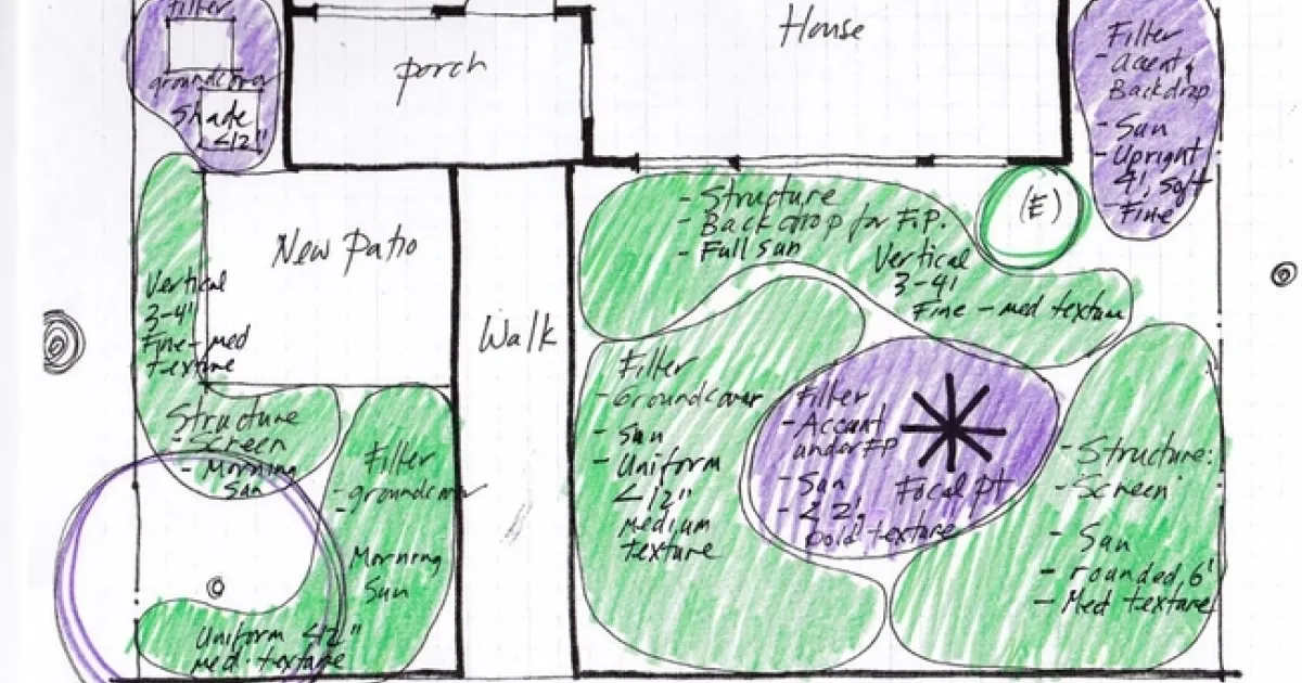 Your completed preliminary planting plan will show separate bubbles labeled with plant form, function, cultural conditions, foliage type (evergreen or deciduous) and plant attributes.