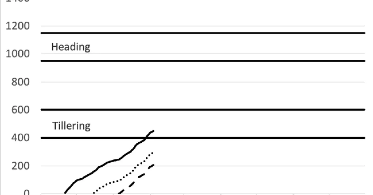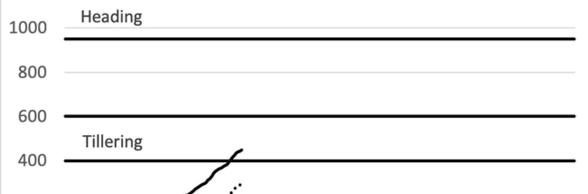 Tillering begins in wheat around 400 GDD and typically lasts until roughly 600 GDD. Nitrogen use efficiency is greatest when nitrogen applications occur during tillering but well before flag leaves begin to emerge (Figure 2).