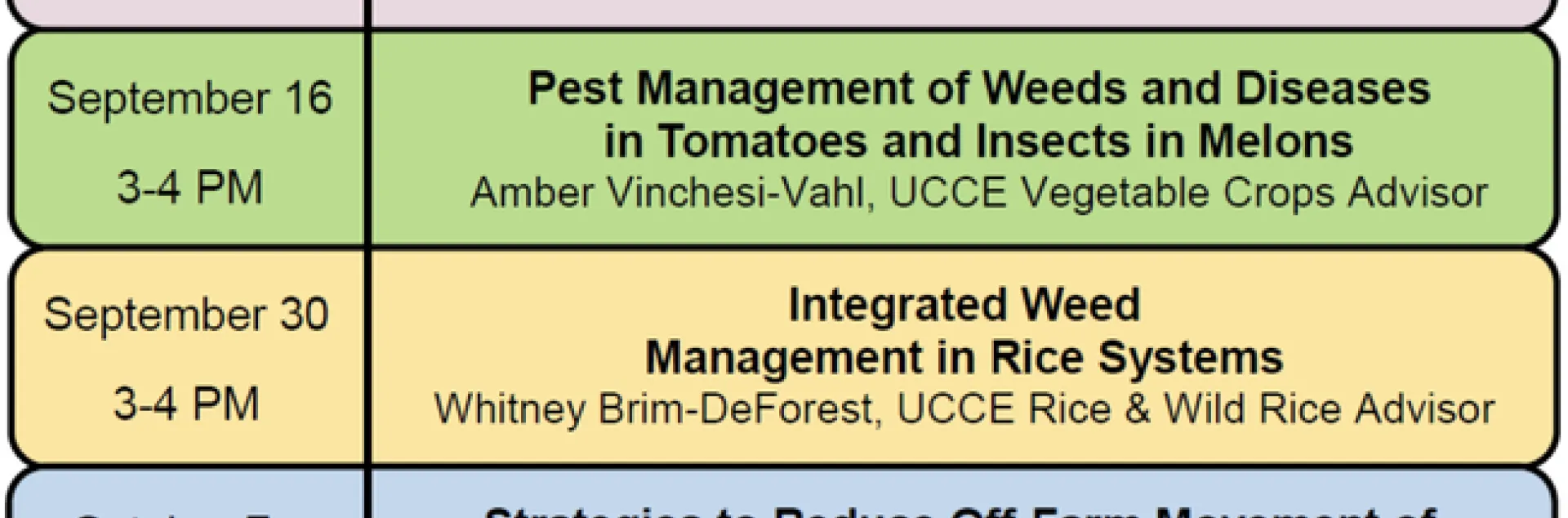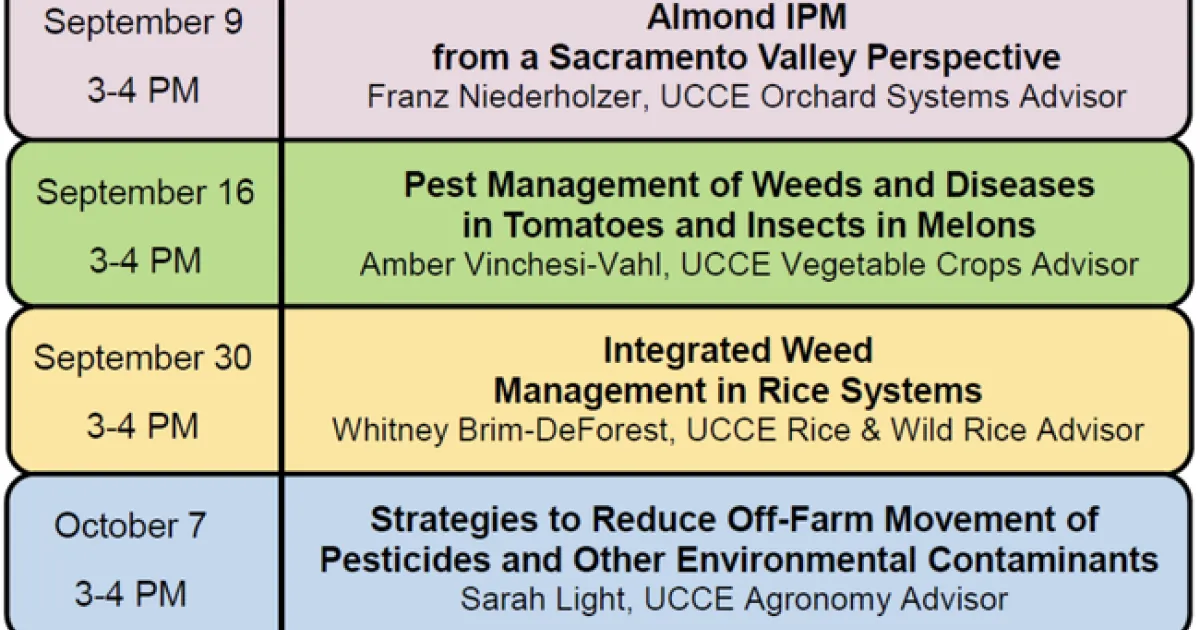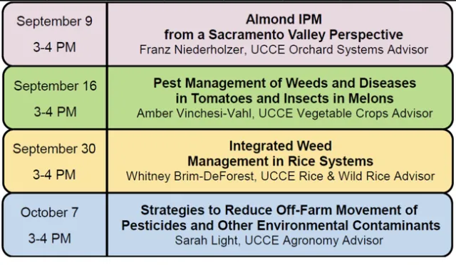 University of California Cooperative Extension Sutter-Yuba-Colusa is holding a series of webinars in September and October to provide research updates on some of the major crops in the Sacramento Valley. The classes are relevant to growers throughout California and are primarily focused on pest management and pesticide safety.