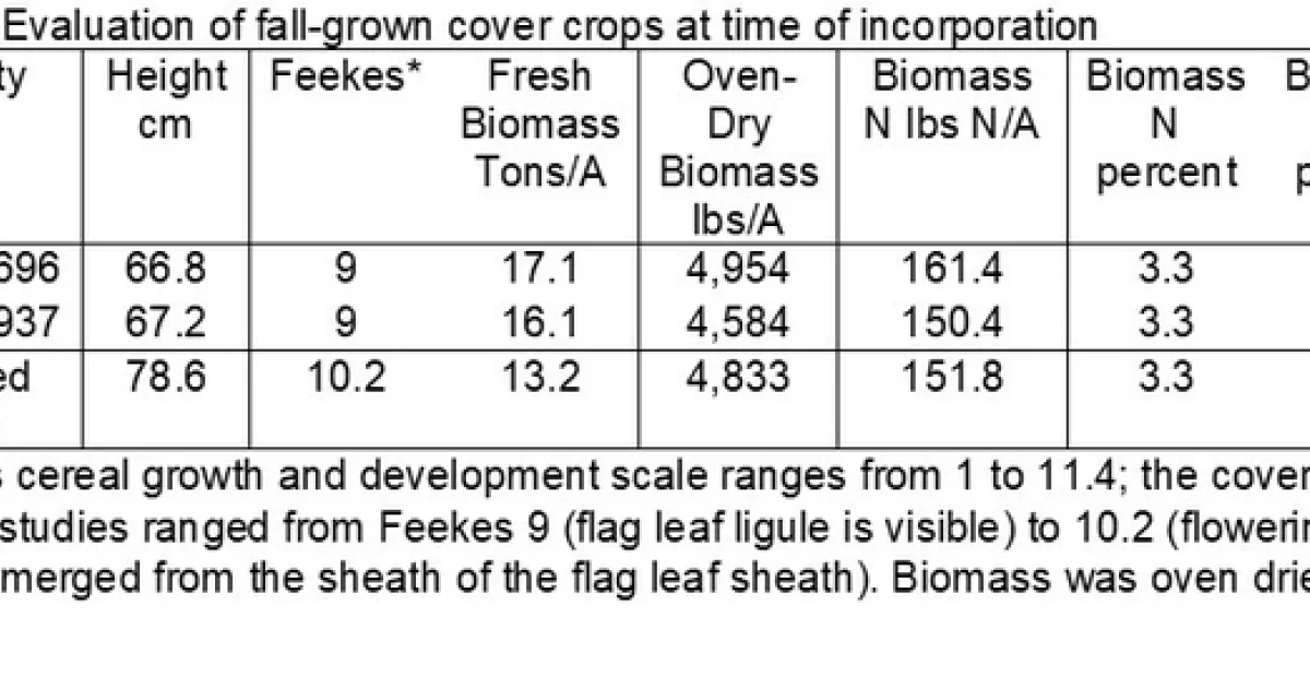 Fall-grown cover crops (planted August-September and incorporated October-November) provide a useful planting slot for a percent of vegetable crop acreage in the Salinas Valley. It is a time when some growers find an opportunity, after two crop rotations, to fit a cover crop in their operations. It has the particular advantage of allowing the grower to incorporate the cover crop and still have time to work the ground when it is still dry before the onset of winter rains.