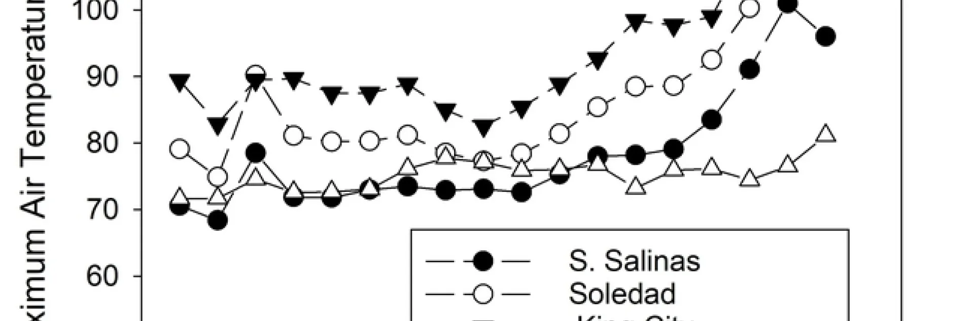 Once again, we are experiencing a prolonged heat wave in the Salinas Valley. Maximum air temperature in the King City area reached 112 °F earlier in the week (Fig. 1). Recent maximum air temperatures in South Salinas have been far greater than the average temperatures recorded for the same period during previous years (2015 through 2019).