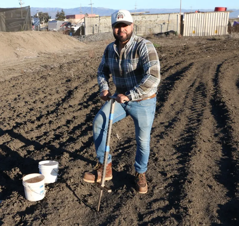 Figure 2. Use a sturdy sampling probe and one-gallon buckets to collect soil cores from various locations and depths within a field.