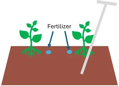 Figure 3.  Collect soil samples in a consistent manner relative to the plant rows and avoid sampling near previous applications of fertilizer.  Here the sampling probe is angled slightly toward the center of the bed from the outside plant row.