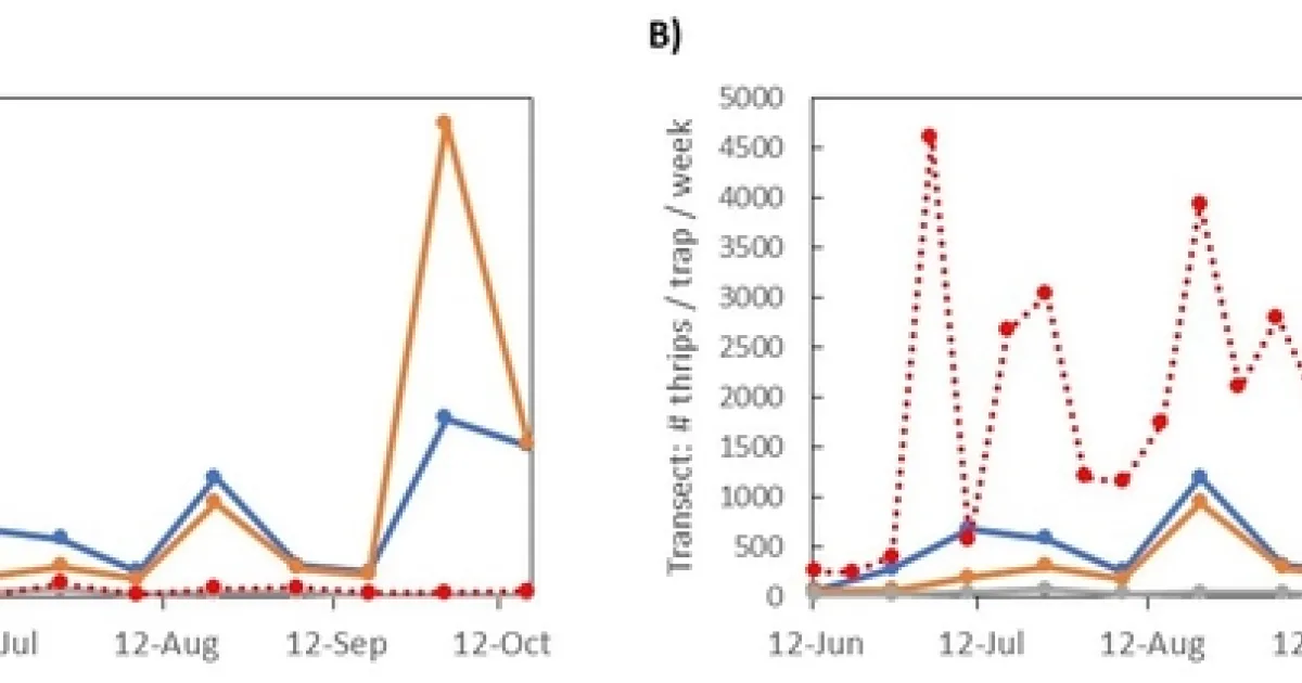 Hypothesis: Thrips migrate down from the hills in late summer and early fall, increasing the thrips pressure in the valley which could increase the risk of spreading INSV.
