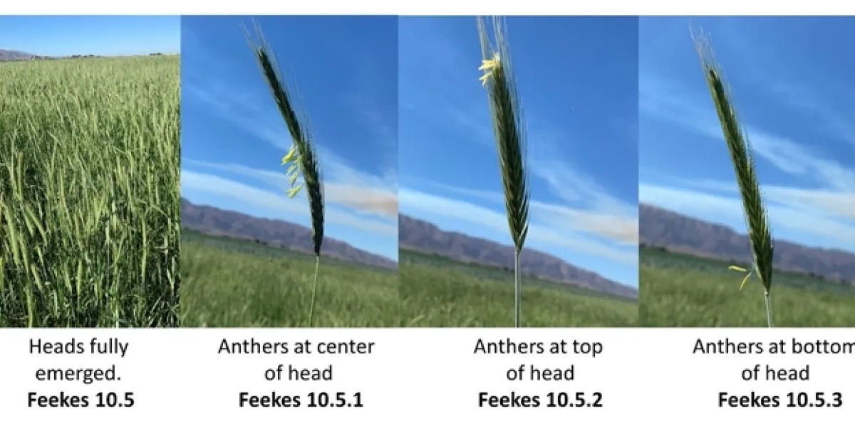 In the central coast region, there is often confusion and concern about when the cover crop will set seed. However, the presence of heads in the cover crop does not mean that seed set is about to happen. Seed formation in cereals follows the relatively lengthy process of pollination and seed development as laid out in the Feekes growth and development chart (Table 1; for a complete chart go to: Kansas State University or University of Wisconsin). Flowering occurs in Feekes stages 10.5.1 to 10.5.3 beginning in the center of the head (Figure 1). During these stages the cover crop is not setting seed but is pollinating. After pollination, the next Feekes stage is 10.5.4 which is when the seed is in the ‘watery ripe' stage (Figure 2). To avoid the risk of viable seed set, we recommend that growers not let their cover crops get past the 10.5.4 Feekes stage. In other words, it is best not to let the seed become milky (11.1) or mealy (soft dough) (11.2) ripe.