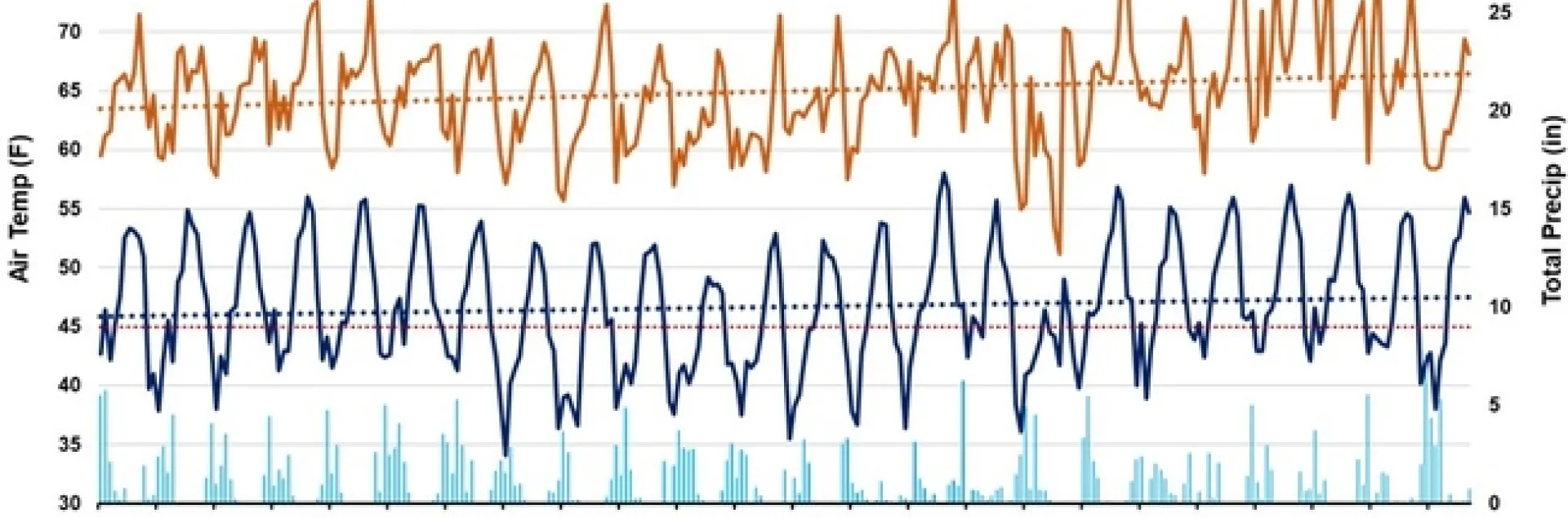 Figure 1: Salinas Valley climate data from 2000 – 2023. Data was obtained from CIMIS 214: Salinas South II station for each month from January 2000 to September 2023 and reported as total precipitation (light blue bars), average maximum air temperature (orange solid line) and overall trend across time (orange dotted line), average minimum air temperature (dark blue solid line) and overall trend across time (dark blue dotted line), and the minimum temperature required for western flower thrips to develop (red dotted line at 45ºF).