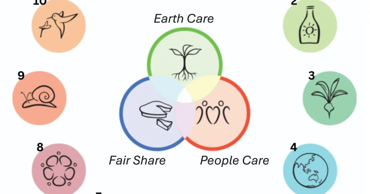 The three ethics that inform permaculture practices and form the basis for its design principles are (1) care for the Earth, (2) care for people, and (3) fair share. These ethics are the foundation for systems that restore and maintain natural resources, promote strong community development, and limit overconsumption and overproduction. The twelve principles of permaculture can be applied to designs in a diverse array of environments, scales, and cultures. The permaculture ethics and design principles are often represented with the following graphic, which shows the three ethics at the center of the twelve principles described below.