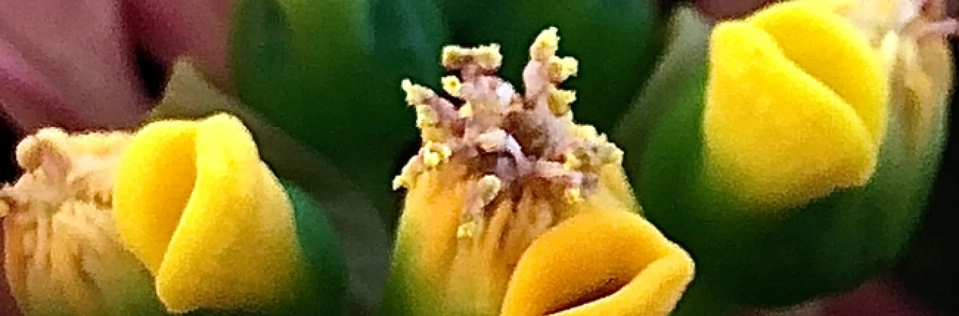 Each “bead” is a flower with both male and female components. The male flowers emerge first and once mature (topped with pollen-filled strands), then the female blossoms along its side- looking like yellow lips and oozing nectar to help trap any falling pollen and entice pollinators. The bracts change color to attract pollinators- facilitating the fertilization process.