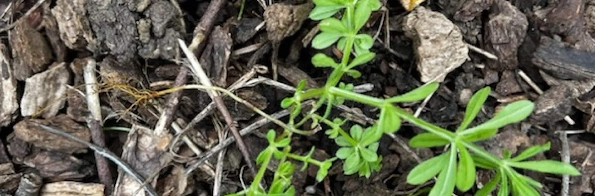 A weed known by many names (bedstraw, cleavers, Velcro plant), Catchweed (Galium aparine) is native to North America and can be found all over California. It is easily identifiable by its oblong whorled leaves and its “sticky” nature due to the hairs on the plant.Catchweed is a common weed in the home garden and can be easily controlled if hand hoed or pulled up before the plant goes to flower. However, if left to mature to flowering,Catchweed will spread seeds easily. Mulching will inhibit the emergence of seedlings, though further management will be required throughout the season.