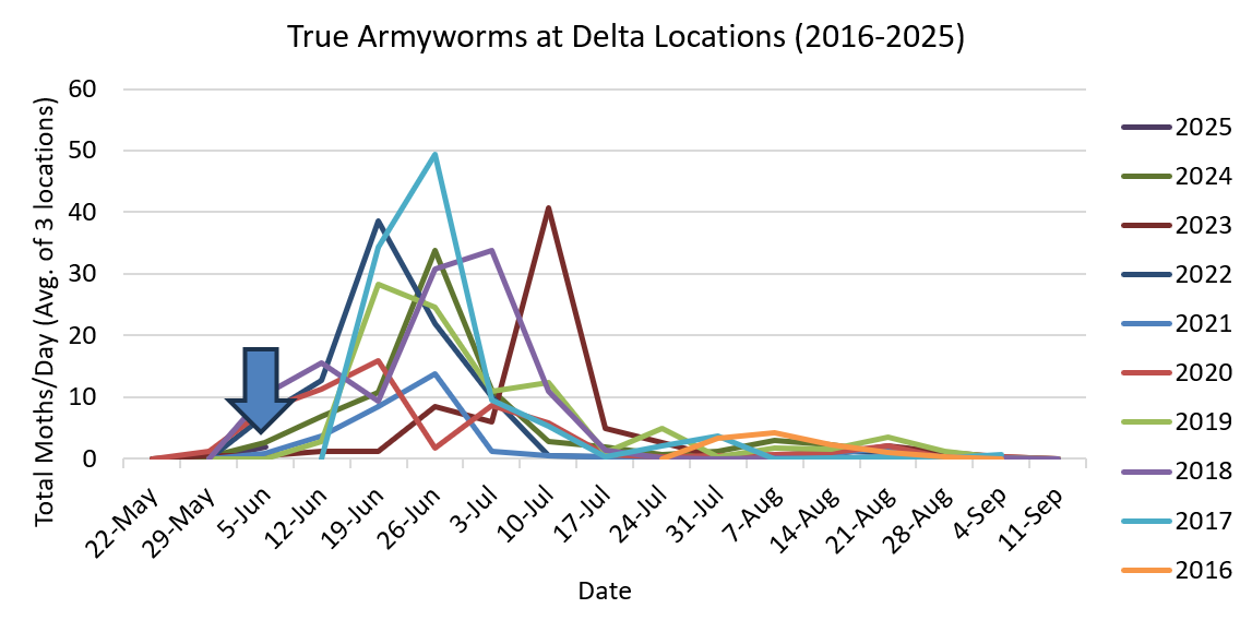 Armyworm larvae will grow to full size and pupate in about 3 to 4 weeks. We have learned over years of trapping that when moth flights peak (usually in early July), that if treatment is warranted, the treatment is most effective if applied in the week or two after the peak moth population. While in the Sacramento Valley, a second peak may be observed in August, we have not observed a second, August peak in the Delta.