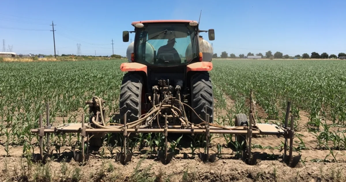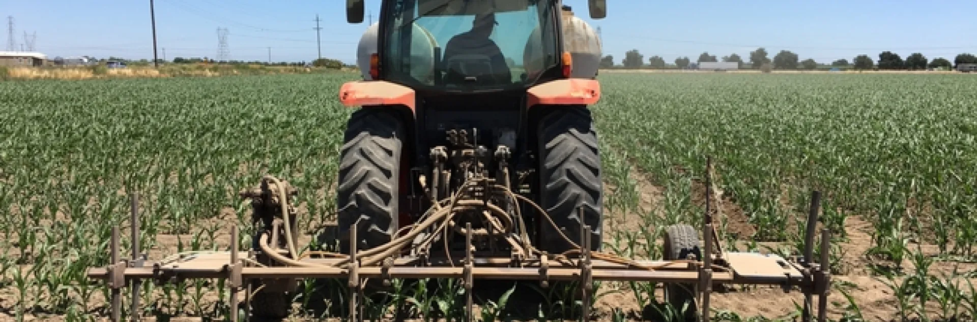 The trial took place in San Joaquin County on a DeVries sandy loam soil. A description of the methods can be found in the full report. Sidedress fertilizer application occurred on June 21, 2018 and provided approximately 105 lbs N per acre (UAN 32). Four treatments were applied at sidedress, when plants were at V3-4 stage of development (Figure 1). The N stabilizers were applied at the label rates, and the treatments were: 1) Vindicate (Corteva Agriscience) at 35 fluid ounces per acre, 2) Agrotain Plus (Koch Agronomic Services) at 3 pounds per acre, 3) combination of Vindicate and Agrotain Plus at aforementioned rates, and 4) fertilizer-only, no stabilizer product (“untreated”). Treatments were randomly applied in three replicate blocks. Aside from the treatments, the trial was managed by the grower in the same manner as the field.