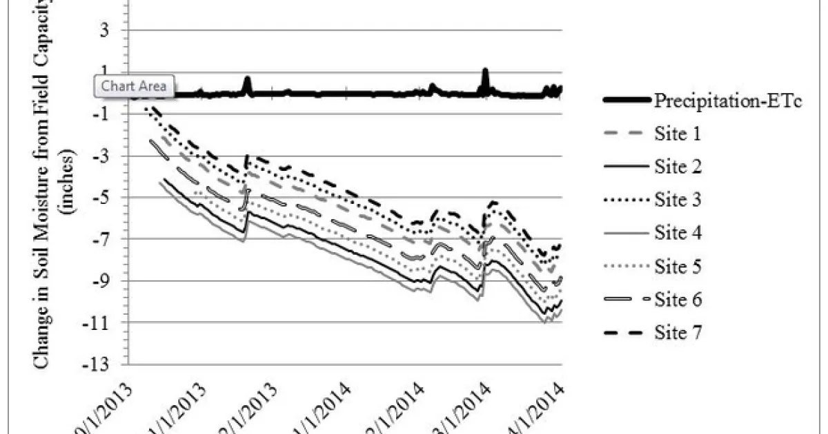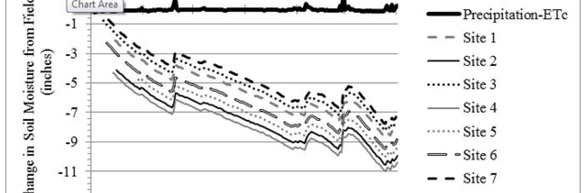 The other lines on the graph (labelled Sites 1-7) illustrate the soil moisture deficit from field capacity. Soil moisture is expressed relative to field capacity because a primary interest in this modelling was to understand how much water is available for leaching salts. Until a soil reaches field capacity, we assume the water is held in the soil and not available for leaching. For all sites, the soil was drier than field capacity in the fall after the last cutting and before the first rain event. The lines decrease (i.e. become more negative) until December 1st because crop water use exceeded precipitation, so the crop drew upon soil moisture. On December 1st, there was a rain event that was enough to exceed ETc, so the soil moisture deficit decreased, but soil moisture was still less than field capacity. This trend continued for the remainder of the winter. If there had been enough precipitation to increase soil moisture above field capacity, then water would have been available for leaching, but this did not happen in Winter 2013-14. Precipitation rarely exceeded ETc, and each alfalfa site remained at a soil moisture deficit over the entire winter. In other words, precipitation was never high enough to fill the soil profiles, exceed the soils' field capacity, and leach salts.
