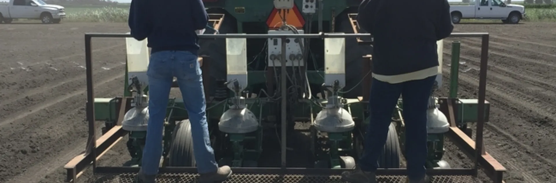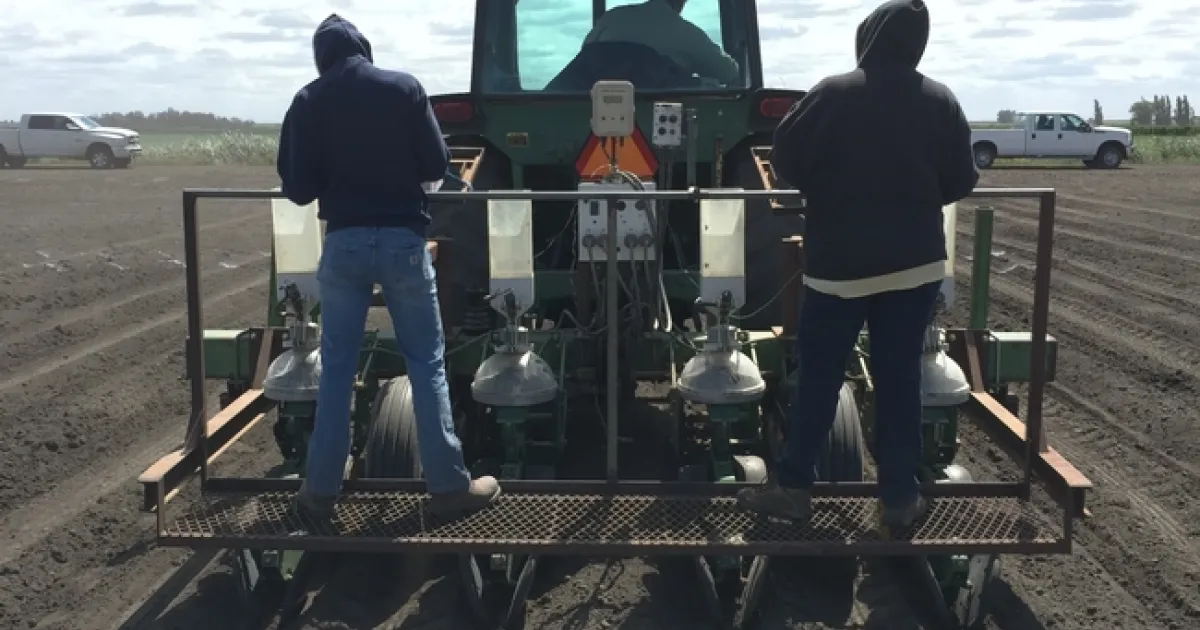 In our trial, we planted Eureka Seeds variety 3292, which is a white sorghum variety being grown for grain. We planted on 30-inch row spacing and about 2 inches deep. The variety label specifies 16,000 seeds per pound with 85 percent germination. The grower's practice will be to plant 12 pounds of seed per acre, based on seed representative and neighboring grower recommendations. Our trial is a randomized complete blocks design with four replicated blocks of five treatments: 5, 6, 9, 12, and 15 pounds per acre. These treatments correspond to approximate plant populations of 68,000, 81,600, 122,400, 163,200, and 204,000 plants per acre, respectively. (This takes into account the 85 percent germination.) Over the course of the season, we will evaluate the trial for stand establishment, weed pressure, and yield in an effort to determine optimum seeding rate.