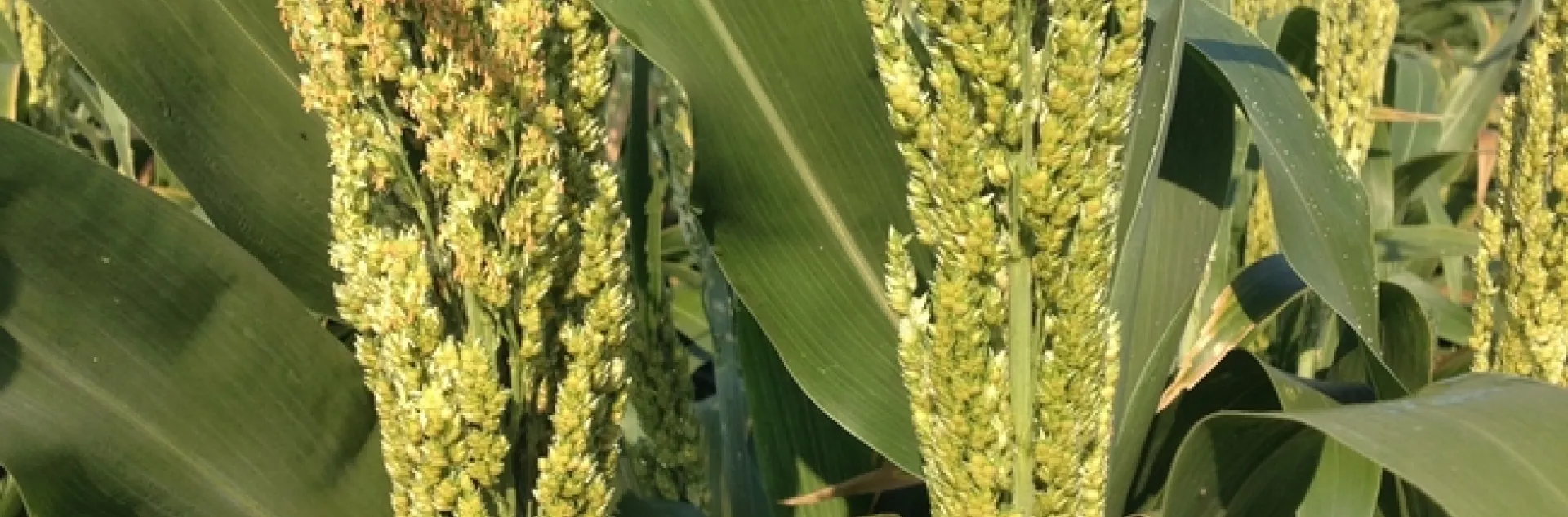 Figure 1. Sorghum panicle at bloom (left). Notice the panicle is shedding orange pollen. Bloom occurs when at least half of the panicle is shedding pollen.We are continuing a trial that we began last year to evaluate optimum seeding rates for grain sorghum. UC research on sorghum has increased over the last few years, primarily in the southern San Joaquin Valley, to evaluate grain and silage sorghum for its adaptability to drought and low-input conditions. This seeding rate trial complements those efforts to provide management information for California growers. The 2017 trial was planted on May 25th, approximately 5 days later than last year's trial, in the Sacramento County Delta. The variety is Eureka Seeds 3325W. The trial consists of five replicated blocks of five treatments: 5, 6, 9, 12, and 15 pounds per acre. These treatments correspond to approximate plant populations of 68,000, 81,600, 122,400, 163,200, and 204,000 plants per acre, respectively. (This takes into account the 85 percent germination for the variety.) To date, we have taken stand and weed counts and have been monitoring bloom (Fig. 1). On average across treatments, bloom occurred 70 days after planting, compared to 71 days last year. At the end of the season, we will measure grain moisture and yield in an effort to better understand optimum seeding rates. Results from last year's trial are available from my website.