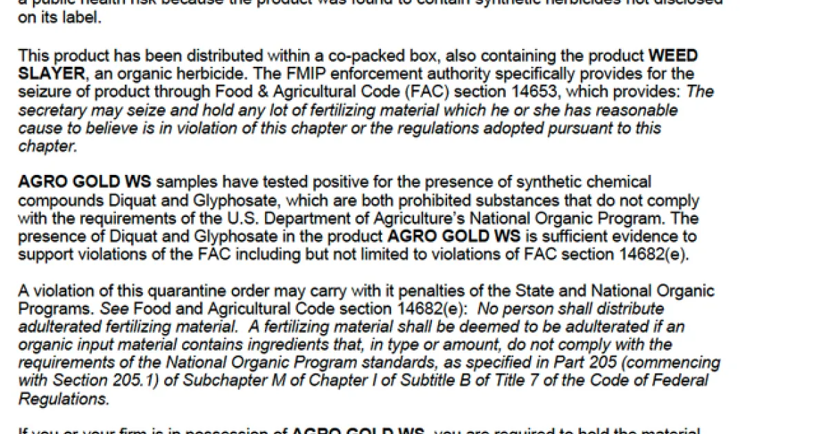 AGRO GOLD WS, Co-packed with Weed Slayer, Found to Contain Both Diquat and Glyphosate