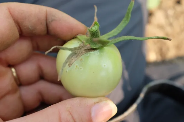 Fruit symptoms are small (? inch), creamy white spots with tan/brown centers found on the upper, exposed parts of the fruit. These characteristic ‘Bird's-eye spots' may eventually become brown, necrotic and merge with other spots. Fruit symptoms can be observed at any stage, but are usually seen on green fruit ½ to 2” diameter.