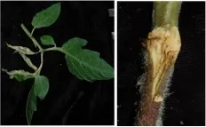 Vascular discoloration, initially yellow, then light brown to reddish, can also be seen in the stem and petiole. Pith appears dry and mealy, as well as discolored. Yellow sticky fluid may emerge from cut stem when squeezed. Stems can split open, forming cankers that facilitate secondary spread.