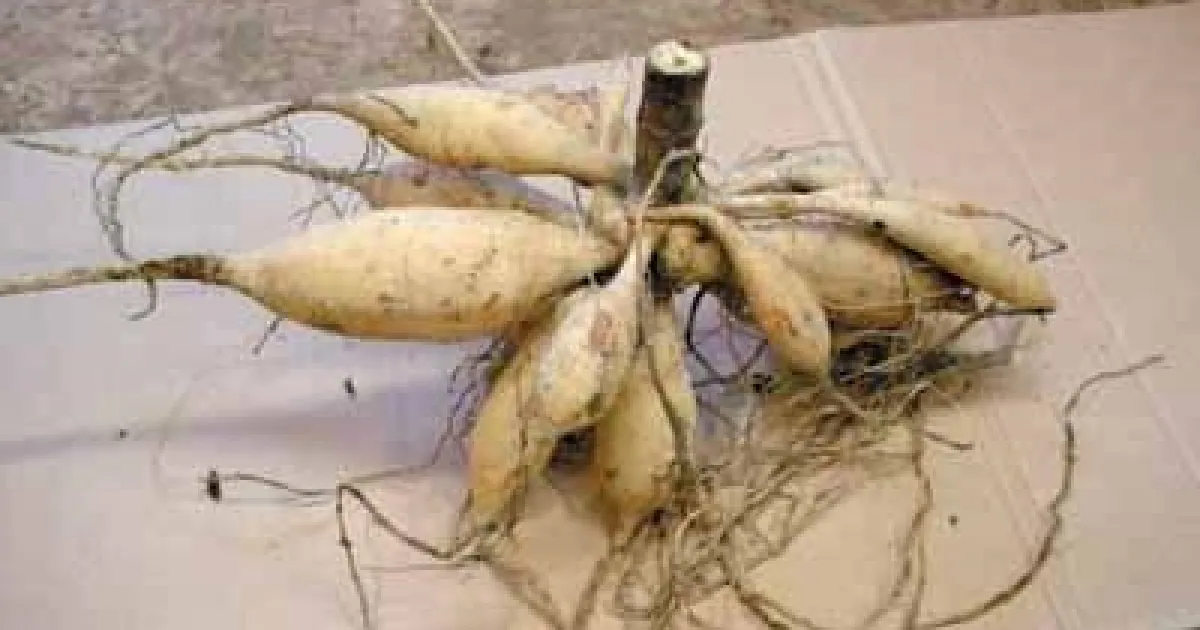 Or as shown in Photo 4 you can clean and trim each tuber with an “Eye”(the “Eye” being where the new stem will grow.) then label the tubers with a ink marker or plastic label then roll them up in plastic wrap with some shavings and store them wrapped. The advantage is they take up less space and you can see how they are doing as well as being able to see the name of the tuber. You will also be able to see how the “Eye” is developing.