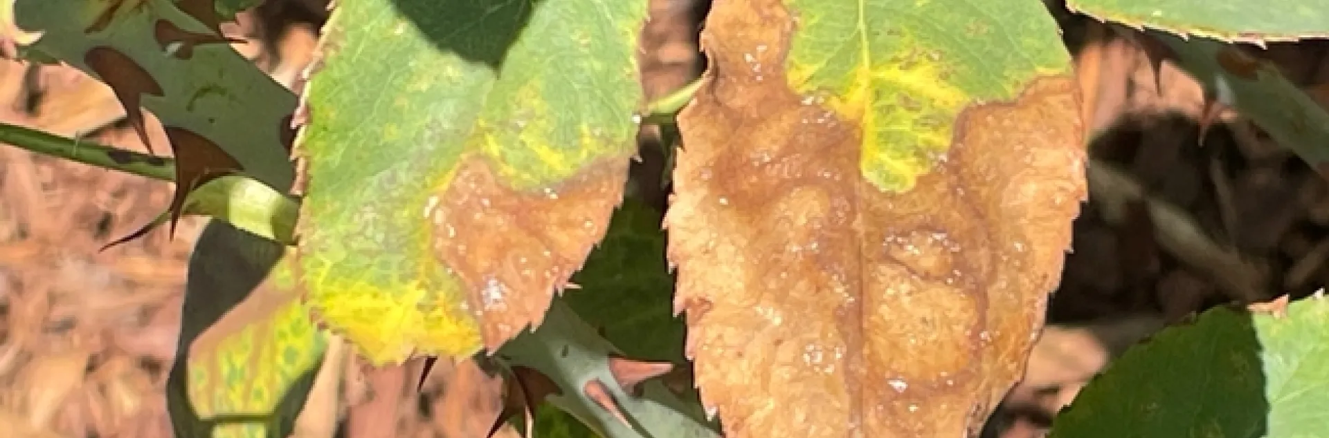 #2 Browning of edges as the picture above shows, the edges / tips turn brown. It is a different brown than fungal infestation; it is clearly a leaf that is baked. You have to remove these as they will not come back. Soak the root ball and make sure that it does not dry out again. Spray the leaves as needed. Use a meter if necessary. If the rose is in a container, you may have to soak the whole container into a tub filled with water, to fully rehydrate the ball–don't drown the ball, just get it thoroughly wet. If it is too big to lift of move, run a hose at a low rate into the container until it is saturated. If the ball is in the ground, using a shovel or trowel to loosen the soil will help get the water down deeper.