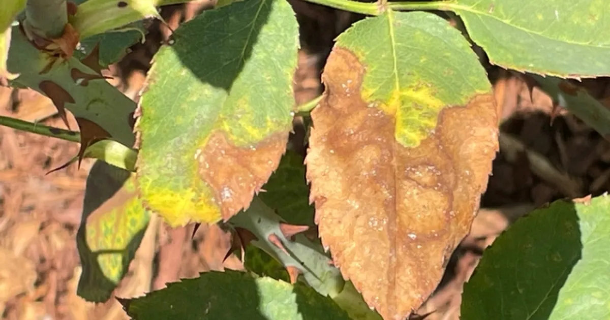 It has been a great summer, the monster rainfall of this past winter and spring a distant memory, and the yard looks wonderful in May and June. You are pumped up about how well your gardening skills have developed. You are getting a sore shoulder from patting yourself on the back in celebration of the glory of your garden. –You smile to yourself and kickback on your rose care diligence. “Where is my wine?” Then July rolled around. Your “wining” has turned to “whining.” “What happened to my roses? The leaves have turned brown and they look awful.”