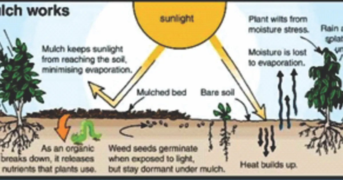 As organic mulch breaks down, nutrients are released into the soil. | Mulch keeps sunlight out, minimizing evaporation. This helps retain water and keep moisture at the roots. | Without sun weed seeds are suppressed | Mulch insulates plant roots, protecting them from temperature fluctuations. | Without mulch heat builds up in the soil and moisture is lost to evaporation. | Without mulch, rain, and wind cause soil to erode. |