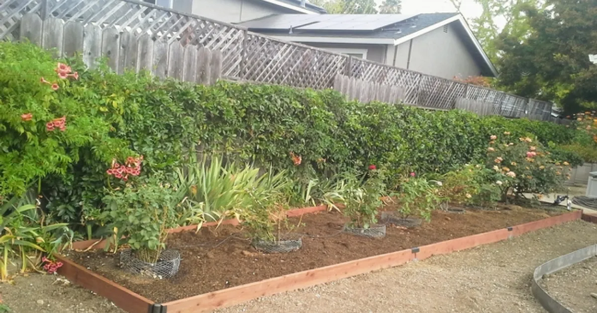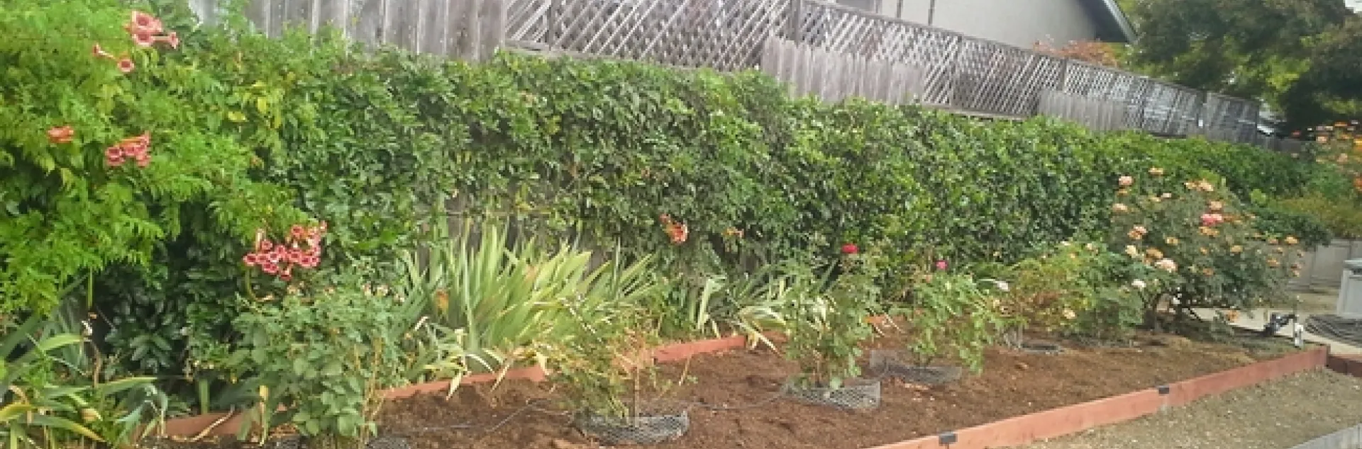 The new trees we planted and the roses that we transplanted are doing very well and seem to enjoy their new locations. We have since installed irrigation in the rose garden, surrounded the area with a 2x6 raised bed and filled it with amended soil. It looks wonderful, I must say.