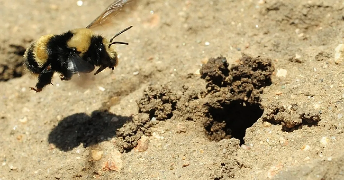 o Mining bees and Digger bees (Adrena): As their names indicate, these bees have a ground-nesting lifestyle. From the outside, the tunnels look like holes with a ring of loose soil around them and can be mistaken for small ant hills or earthworm mounds. Mining bees are active only in the spring for 4-8 weeks during which the females dig tunnels to lay their eggs and raise their young. Both bees are extremely docile, rarely stinging.