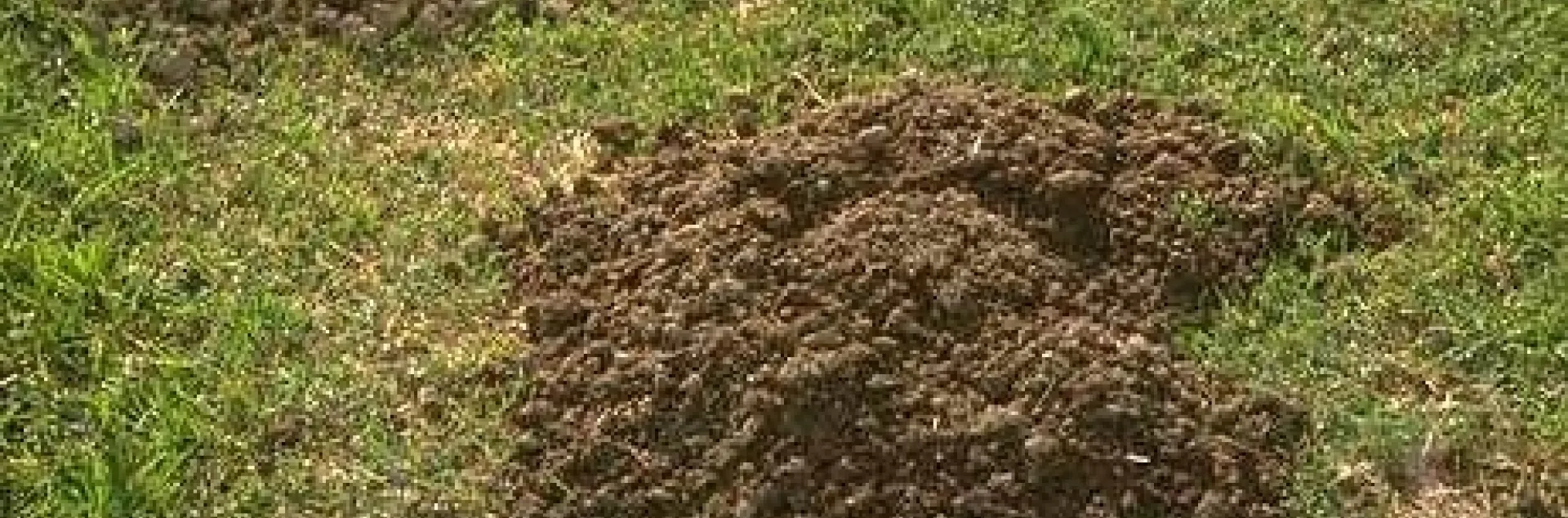 Characteristic crescent shaped mound of a pocket gopher. (UC IPM, Jack Kelly Clark)Gophers are well-known and certainly unwelcome pests in landscapes, gardens, lawns, and athletic turf. More correctly called pocket gophers, these rodents mostly remain hidden underground in tunnels and feed on plants from below, sometimes pulling whole plants into their tunnels. They prefer herbaceous plants but will eat a wide range of vegetation.