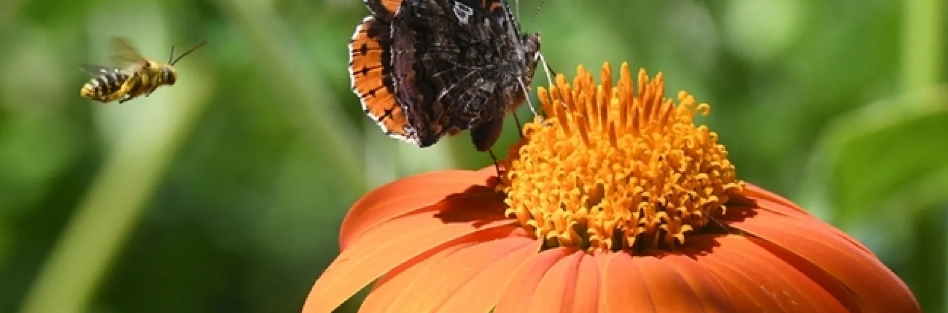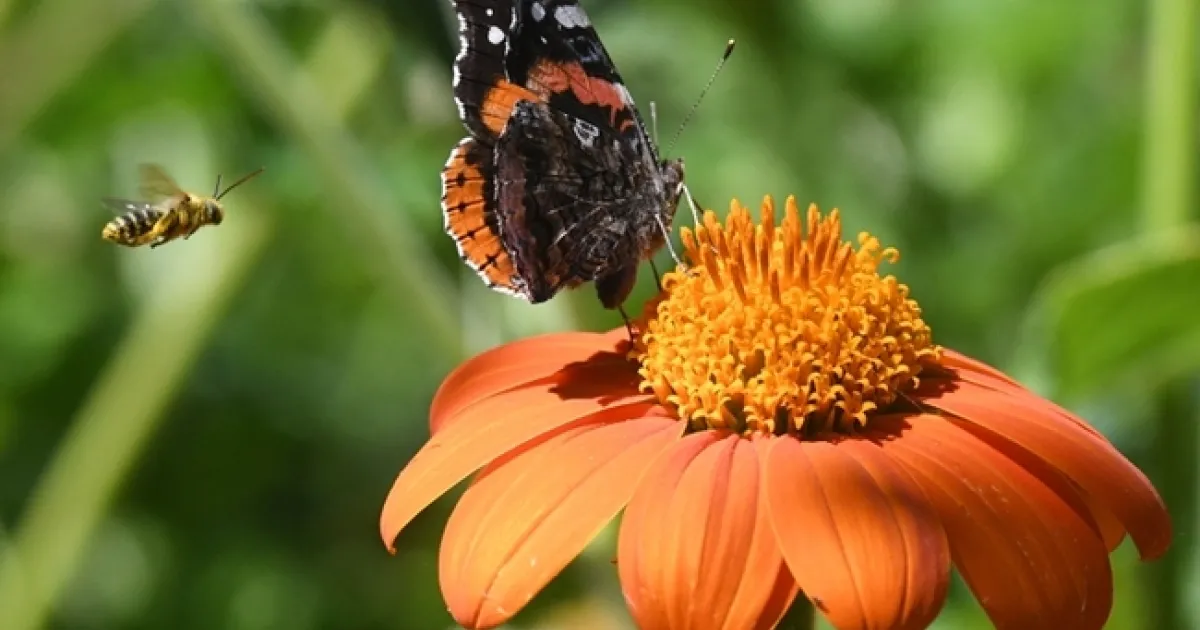 Male longhorn bee and red admiral butterfly on Tithonia. (Kathy Keatley Garvey, UC Davis Entomology and Nematology)