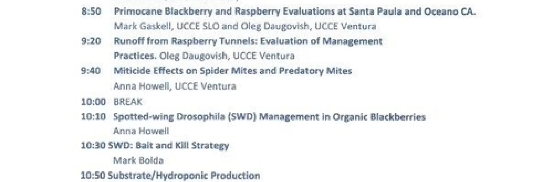 My colleague Oleg Daugovish has been super generous and is offering his annual caneberry meeting this year up in Watsonville so we can all be together and mites (including Lewis mite), substrates from an expert, plant nutrition, tunnel management, new variety evaluations for blackberries and raspberries, and a discussion of market trends are all on tap.
