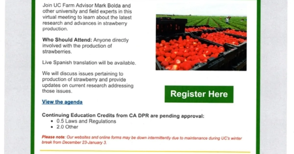 Happy New Year all! We are spooling up quickly with our annual strawberry production meeting, and have the morning of February 2 blocked out for this event. While unfortunately we have to do another round of ZOOM, we will be enjoying the excellent meeting administration of UC ANR Event Services, not to mention the usual high quality of speaker and content.