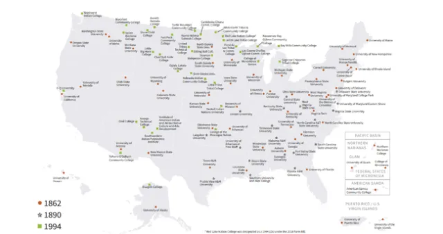 The 1862s are land grant universities that were established by the 1862 Morrill Act. This act gave ‘public lands' to every state, most of which was sold to create endowments for universities with programs in agriculture and engineering. Today, these are mostly the big state schools, like the University of California or Penn State, where Cooperative Extension programs are run from. The 1890s are historically Black Colleges and Universities, which Congress had to establish through separate legislation because the 1862 schools discriminated against people of color. Finally, more than a hundred years later, Congress provided funding in 1994 to support Tribal Colleges and Universities, collectively known as the 1994s or TCUs.