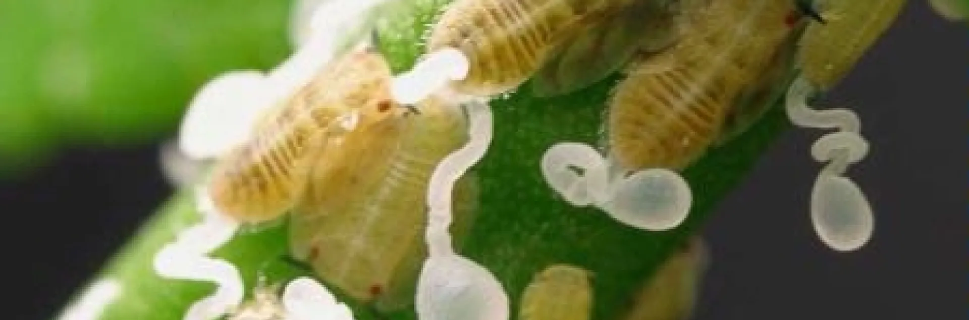 Photo below.  Asian Citrus Psyllid nymphs with waxy exudates from feeding.