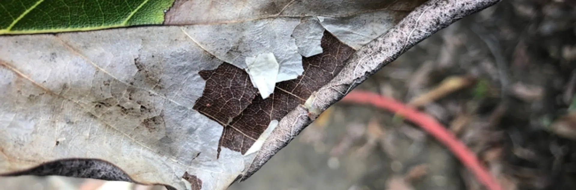 An avocado leaf with its cuticle (white, paperlike surface) being exposed by underlying leaf fungi.