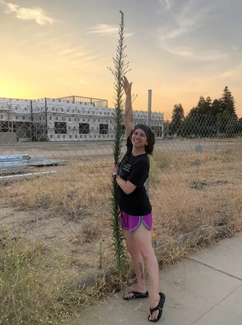 Horseweed growth habit. At bolting, horseweed sends up a single, erect stem upon which flowers are produced. Horseweed stems can reach heights up to 10 feet. For comparison, Lynn Sosnoskie, an author of this post, is 5'3” tall. Photo by D. D. MacLean.